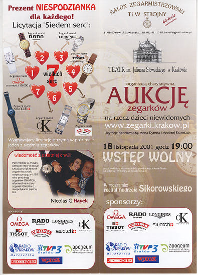 60-lecie firmy postanawiamy uczcić organizując aukcję zegarków należących do sławnych ludzi. Aukcja odbywa się w Teatrze im. J. Słowackiego i licytujemy kilkadziesiąt zegarków, między innymi zegarki: Lecha Wałęsy, Helmuta Kohla, Romana Polańskiego, Annie Lennox, udaje się nam zarobić ponad 100 tys. złotych! Kupujemy niewidomym dzieciom z ulicy Tynieckiej mikrobus, wysyłamy małą...