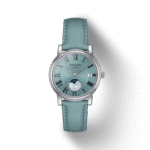 Unikatowy design, wyczucie stylu i piękne wykończenia sprawiają, że kolekcja Tissot Carson Premium gwarantuje doskonały wygląd każdego nadgarstka. Linia Tissot Carson Premium Lady jest dostępna w różnych wersjach -ze skórzaną lub stalową bransoletą 316L, z powłoką PVD lub w klasycznej wersji ze stali szlachetnej. Tissot Carson Premium Lady Moonphase o średnicy 32 mm posiada wskaźnik fazy księżyca, który jest zarówno centralnym elementem tarczy, jak i użyteczną funkcją. Inne funkcje obejmują szwajcarski mechanizm kwarcowy, odporne na zarysowania szafirowe szkło, kopertę ze stali szlachetnej 316L i datownik. Smukłe, zakrzywione wskazówki dopełniają elegancki wygląd tego damskiego zegarka. Model ten posiada zielono-niebieską tarczę z dużymi rzymskimi cyframi oraz zielono-niebieski skórzany pasek z systemem szybkiej wymiany i sprzączką.