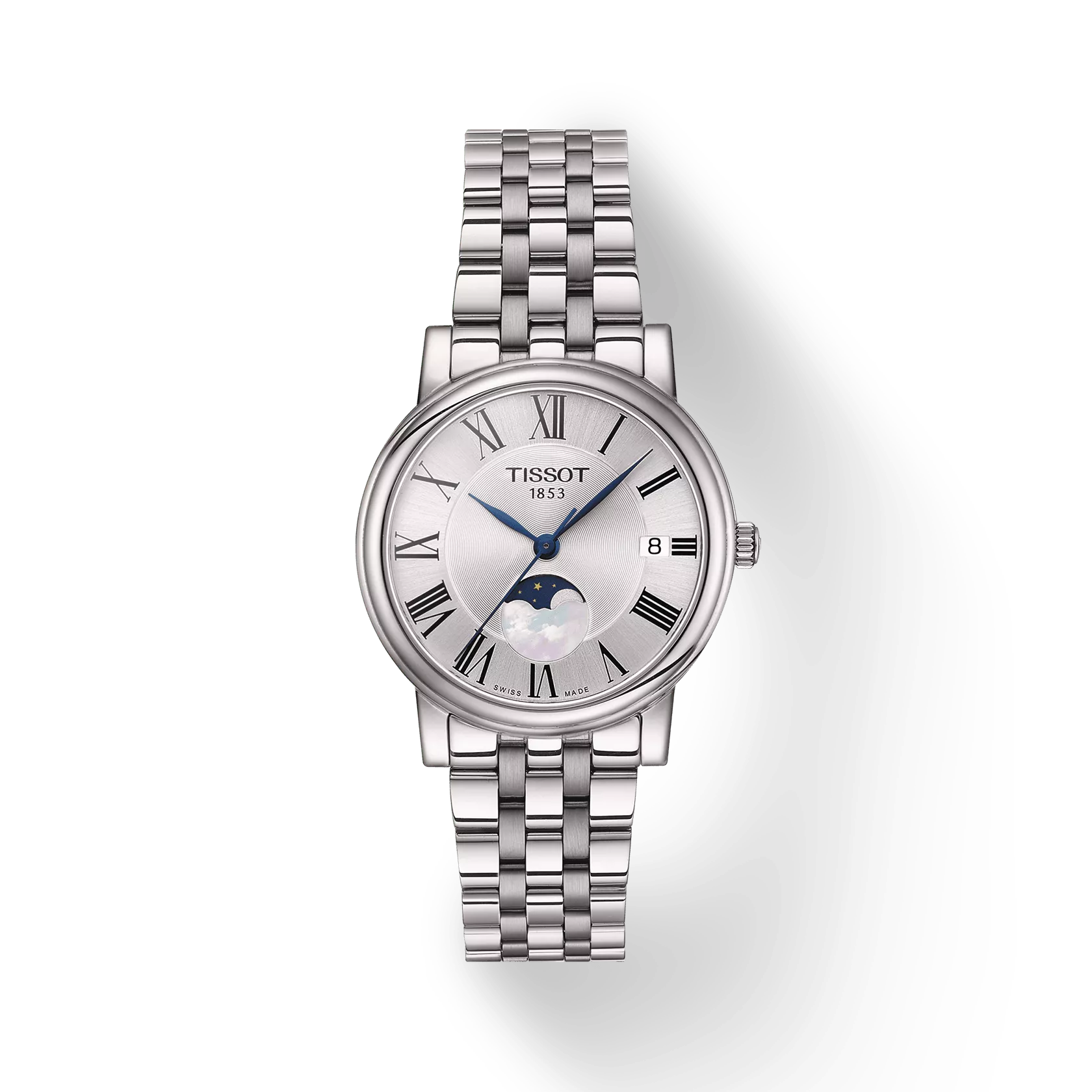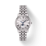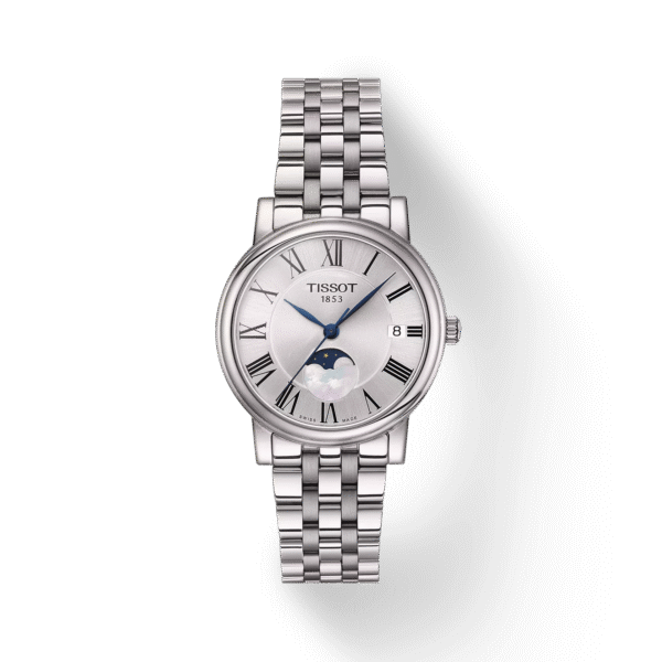 Linia zegarków Tissot Carson Lady Moonphase  to przepiękne, klasyczne modele czasomierzy z czytelną tarczą wraz z fazami księżyca w różnych wersjach kolorystycznych na skórzanym pasku lub stalowej bransolecie z pozłoceniem lub bez. Tissot Carson Lady Moonphase to styl i nienachalna elegancja dla każdego. Czasomierz objęty  jest dwuletnią, międzynarodową gwarancją producenta.