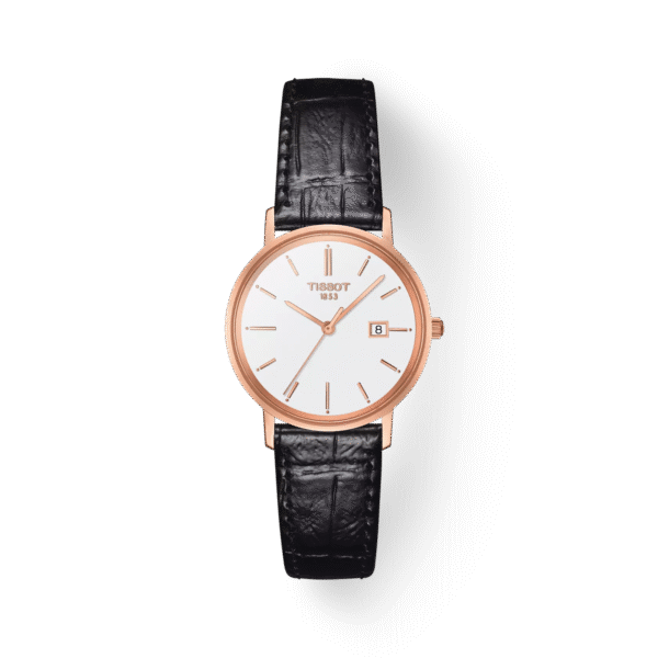 Linia zegarków Tissot Goldrum Lady  18k Gold  to ponadczasowa klasyka, elegancja, styl zamknięty w złotej kopercie wykonanej z 18k różowego złota. Tarcza jest  czytelna, niezwykle prosta i zarazem bardzo elegancka. Wskazówki są w kolorze różowego złota. Grubość czasomierza wynosi  zaledwie 5  mm. Wewnątrz pracuje szwajcarski mechanizm  kwarcowy ETA E61.11. Wszystkie modele z linii Tissot Goldrum Lady  18k Gold posiadają EOL czyli wskaźnik zużycia baterii, który informuje nas o potrzebie jej wymiany. Linia zegarków Tissot Goldrum Lady  18k Gold objęta jest dwuletnią, międzynarodową gwarancją producenta.