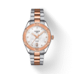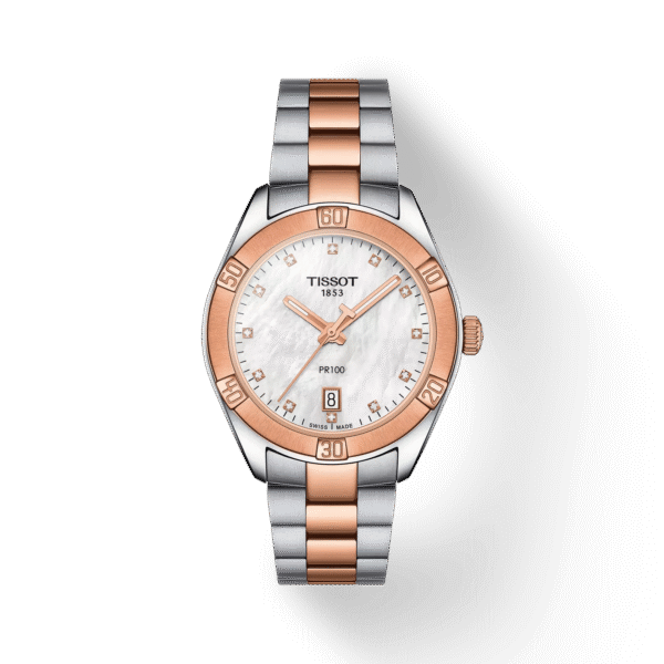 Tissot PR 100 to jeden z najbardziej klasycznych, eleganckich, a za razem sportowych modeli w ofercie szwajcarskiego producenta. Koperta o rozmiarze 36 mm kryje mechanizm kwarcowy. Tarcza jest niezwykle czytelna, wskazówki pokryte substancją fosforyzującą z pewnością ułatwią odczyt wskazań w słabym oświetleniu. Na szczególną uwagę zasługują brylantowe indeksy, masa perłowa na tarczy. Koperta czasomierza została wykonana ze stali. Pierścień pozłocono metodą PVD w odcieniu różowego złota. Całości dopełnia bransoleta bikolor łącząca stal z elementami PVD w odcieniu różowego złota. Tissot PR 100 objęty jest dwuletnią, międzynarodową gwarancją producenta.