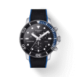 Mamy przyjemność zaprezentować przepiękny sportowy model Tissot Seastar Chronograf w rozmiarze 45,5 mm. Ten zegarek to ciekawa propozycja dla miłośników sportów wodnych. Ma bardzo wysoką wodoszczelność do ciśnienia 30 barów (300 m/1000 stóp), zakręcaną koronkę oraz obracany w jedną stronę pierścień umożliwiający odczytanie czasu zanurzenia.Tissot Seastar objęty jest dwuletnią, międzynarodową gwarancją producenta.