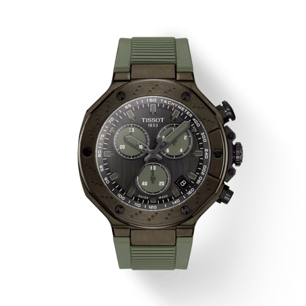 Motocykle to coś więcej niż środek transportu – to styl życia. Motocykliści mogą zademonstrować przynależność do tej społeczności dzięki kolekcji Tissot T-Race. Design Tissot T-Race Quartz Chronograph podkreślony jest elegancką tarczą, nie odcinając się przy tym od swoich sportowych korzeni. Tissot czerpał inspirację ze swojego partnerstwa z wyścigami motocyklowymi, aby stworzyć zegarek, który odzwierciedla dynamikę motocykli i emocje związane z tym sportem. Jest wodoszczelny do ciśnienia 10 barów (100 metrów), posiada precyzyjny kwarcowy mechanizm chronografu oraz wskazówki godzinowe i minutowe pokryte SuperlumiNova, co ułatwia odczyt godziny nawet przy słabym oświetleniu. Ta wersja zegarka Tissot T-Race Quartz Chronograph posiada 45-milimetrową kopertę wykonaną ze stali szlachetnej 316L z ciemnozieloną powłoką PVD oraz ciemnoszarą tarczę z ciemnozielonymi wskazówkami i indeksami. Odporne na zarysowania, antyrefleksyjne szafirowe szkło gwarantuje zwiększoną wytrzymałość. Sportowy, zielony silikonowy pasek ze sprzączką dopełnia efektownego wyglądu. Czasomierz objęty jest dwuletnią, międzynarodową gwarancją producenta.