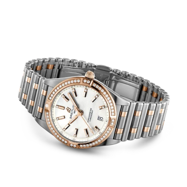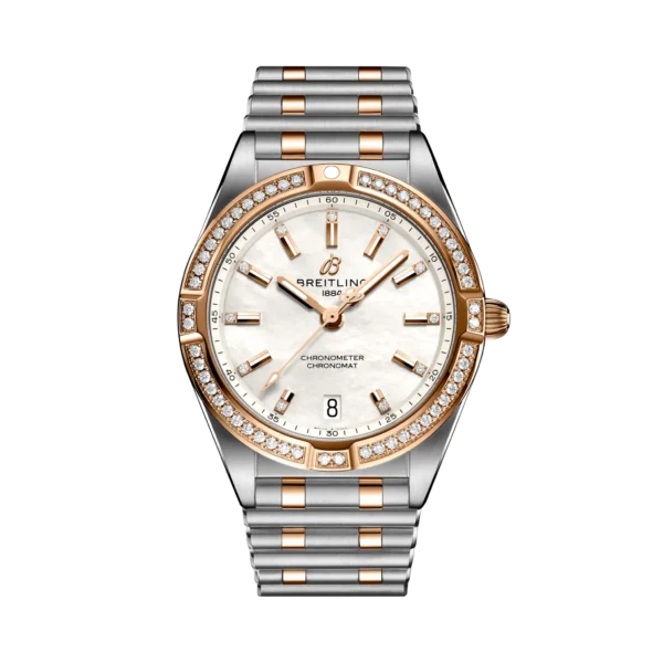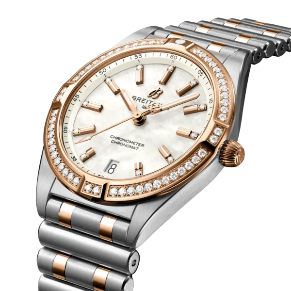 Stylowy, a jednocześnie elegancki, inspirowany nowoczesnym stylem retro Chronomat 32 to wszechstronny sportowy i elegancki zegarek na każdą okazję. Jest dostępny w wielu metalowych obudowach, od chłodnej stali nierdzewnej po wszystko, co pasuje do wszystkiego, a nawet luksusowe 18-karatowe czerwone złoto. Kobiety pragnące dodatkowego blasku będą mogły również zdecydować się na wysadzane diamentami pierścienie, indeksy i kolorowe cyferblaty. Wyposażony w kultową i wygodną bransoletkę Breitling „Rouleaux” z zapięciem motylkowym, Chronomat 32 jest zasilany przez Breitling Calibre 77, chronometr SuperQuartz™ z certyfikatem COSC.