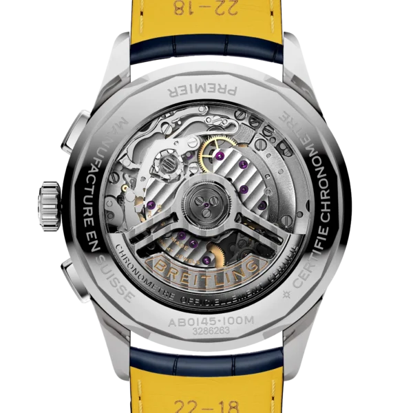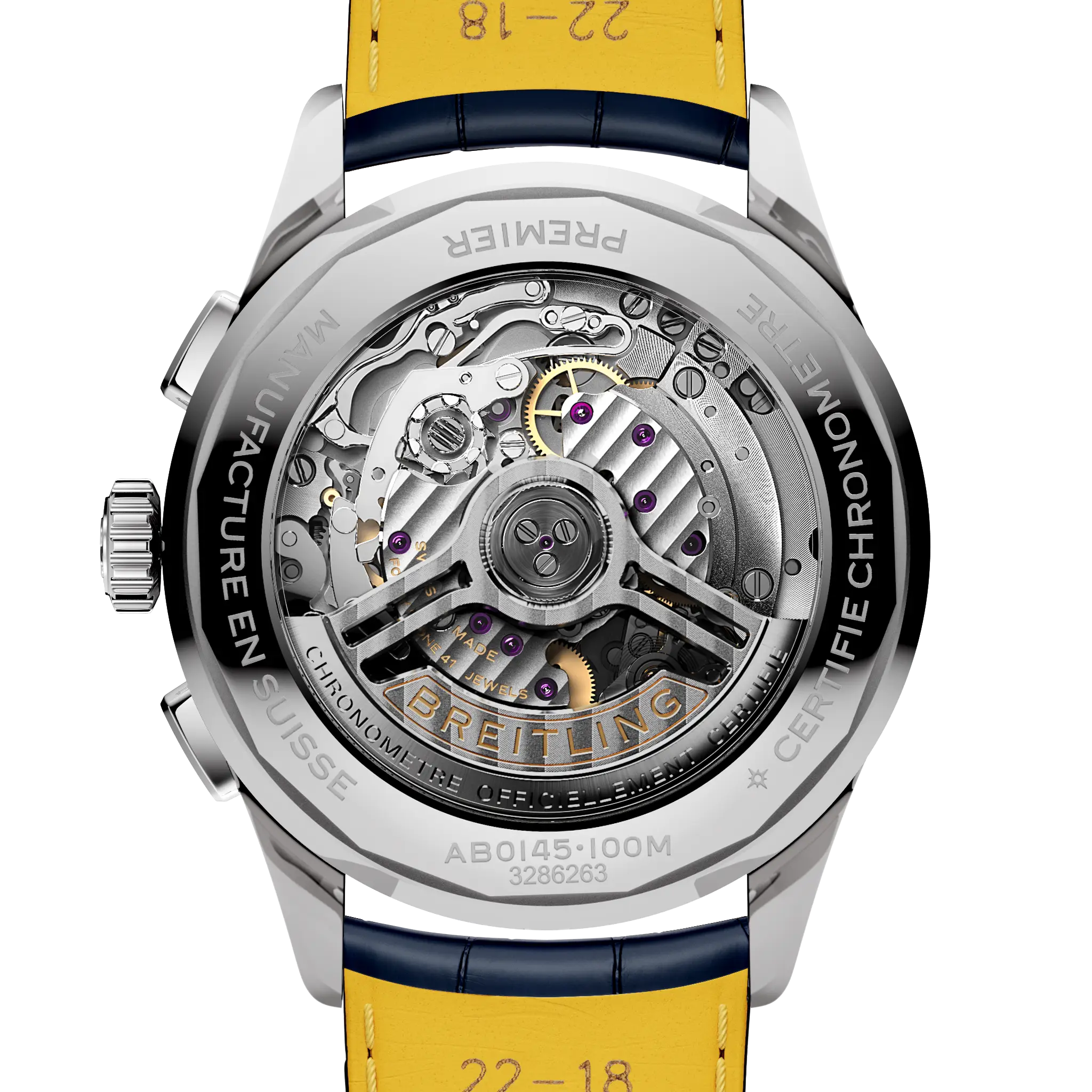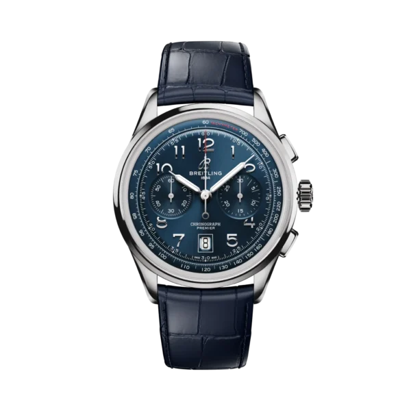 Na początku lat czterdziestych Willy Breitling marzył już o czasie po wojnie, kiedy użyteczność ustąpi miejsca nieokiełznanemu optymizmowi. Zaczął projektować chronograf, który byłby funkcjonalny, ale także niezaprzeczalnie elegancki i nieskończenie wygodny w noszeniu – jego zdaniem „niewątpliwy znak nienagannego smaku”. Nazwał tę nową linię Premier. Aby stworzyć nowoczesny model Premier, Breitling zachował charakterystyczne detale w stylu vintage. Czasomierz posiada charakterystyczne opływowe, przyciski obsługujące chronograf. Model Premier B01 Chronograph 42 jest dostępny z szeroką gamą kolorów tarczy i materiałów, z których wykonana jest koperta. Do wyboru jest klasyczny pasek ze skóry aligatora lub elegancka metalowa bransoleta z 7 rzędami. Dzisiejszy Premier również spełnia bezkompromisowe standardy techniczne Willy’ego Breitlinga dzięki wyjątkowemu samozwijającemu się mechanizmowi — certyfikowanemu przez COSC kaliberowi produkcji Breitling 01 — zaprojektowanemu z myślą o maksymalnej precyzji, niezawodności i funkcjonalności. Premier B01 Chronograph 42mm objęty jest pięcioletnią, międzynarodową gwarancją producenta.