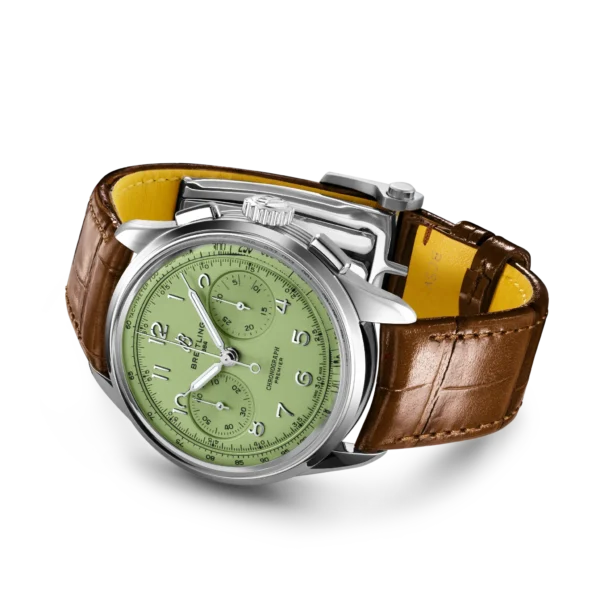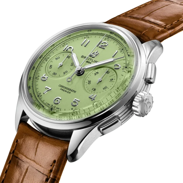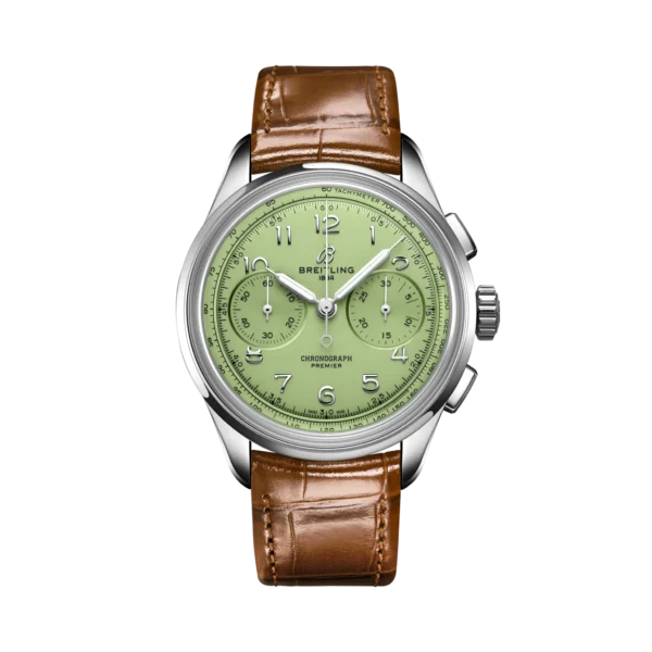 Składając hołd trzem pokoleniom wynalazców – Léonowi, Gastonowi i Willy’emu Breitlingowi – Premier B09 Chronograph ukazuje doświadczenie zegarmistrzowskie Breitlinga. Najnowsza generacja chronografów Premier przywraca do życia swoją ponadczasową elegancję i prezentuje najwyższy poziom zegarmistrzostwa Breitling dzięki gamie kultowych komplikacji Premier: chronografowi, duografowi i modelowi datora. Wyposażone w prostokątne przyciski chronografu, i cyfry arabskie, odnowione chronografy Premier mają szereg eleganckich detali, takich jak rowki na bokach koperty, przeszklone, szafirowe dekielki i wskazówki inspirowane stylem vintage. Chronograf jest dostępny w dwóch wersjach: ze stali nierdzewnej z zieloną pistacjową tarczą i złotobrązowym paskiem ze skóry aligatora lub z 18-karatowego czerwonego złota ze srebrną tarczą i brązowym paskiem z aligatora. Chronograf jest zasilany ręcznie nakręcanym, certyfikowanym przez COSC kalibrem Breitling Manufacture Calibre B09.