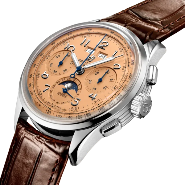 Składając hołd trzem pokoleniom wynalazców – Léonowi, Gastonowi i Willy’emu Breitlingowi – Premier Datora to najbardziej wyrafinowany chronograf Breitling z pełnym kalendarzem i fazami księżyca. Jak powiedział Willy Breitling, Premier to „niewątpliwa pieczęć nienagannego smaku”. Najnowsza generacja chronografów Premier przywraca do życia swoją ponadczasową elegancję i prezentuje najwyższy poziom zegarmistrzostwa Breitling dzięki gamie kultowych komplikacji chronografowi, duografowi i datorowi. Wyposażony w prostokątne przyciski chronografu i cyfry arabskie, odnowiony zegarek Premier Datora ma szereg eleganckich detali, takich jak rowki na bokach koperty, otwarte szafirowe dekielki i wskazówki inspirowane stylem vintage. Datora jest dostępny w dwóch wersjach: ze stali nierdzewnej z miedzianą tarczą i brązowym paskiem ze skóry aligatora lub z 18-karatowego czerwonego złota ze srebrną tarczą i brązowym paskiem ze skóry aligatora. „Datora” to termin używany przez Breitlinga w latach czterdziestych XX wieku i odnosi się do kompletnego chronografu z kalendarzem wyświetlającego dzień, datę, miesiąc i fazy księżyca. Datora jest napędzany certyfikowanym przez COSC mechanizmem manufakturowym B25.