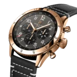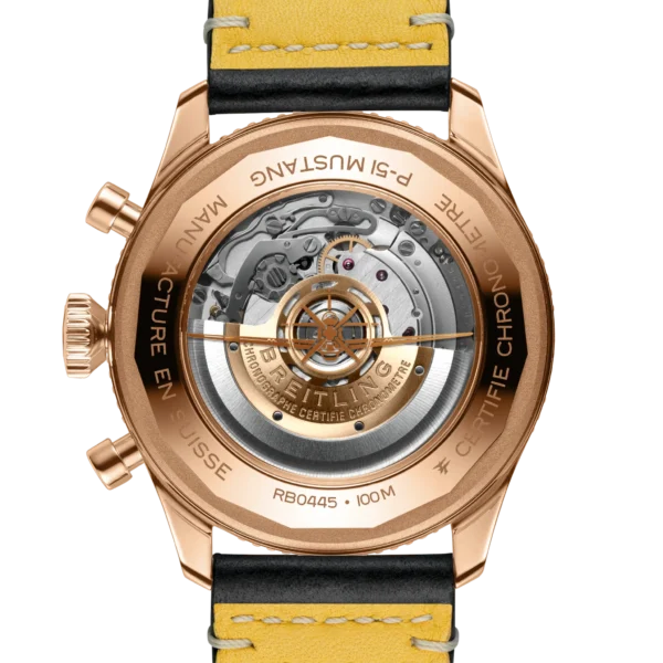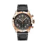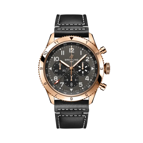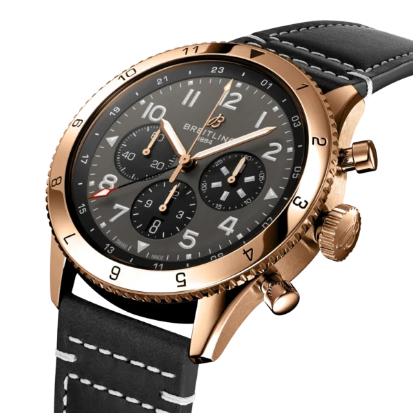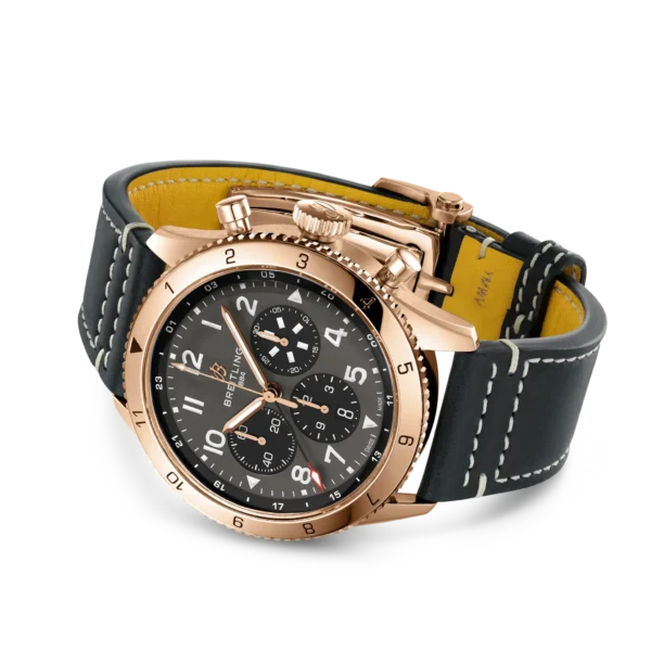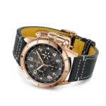 Breitling Super Avi B04 Chronograph GMT 46P-51 Mustang 18k Red Gold – Anthracite to przepiękny, czasomierz bedąc swoistym hołdem dla legendarnego samolotu z II Wojny ŚwiatowejP-51 Mustang. Breitling przy projektowaniu tego modelu postanowił sięgnąć do bogatej historii marki, która od dawna była związana z lotnictwem. W latach 30-tych XX wieku Breitling Huit zaprojektował precyzyjne zegary wykorzystane w kopcicie samolotu. Dwie dekady później Breitling zaproponował zegarek dla pilotów o ref. 765 AVI. Właśnie ten wyjątkowy czasomierz stał się pierwowzorem dla kolekcji współczenych modeli który mamy zaszczyt zaprezentować naszym klientom. Zegarek jest bardzo czytelny, jego rozmiar wynosi 46 mm, znacznych rozmiarów koronka usytuowana jest na godzinie trzeciej. Czasomierz naręczny posiada drugą strefę czasową, manufakturowy mechanizm Calibre B04, certyfikowany przez COSC. Breitling Super Avi B04 Chronograph GMT 46P-51 Mustang 18k Red Gold – Anthracite objęty jest pięcioletnią gwarancją producenta.