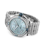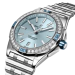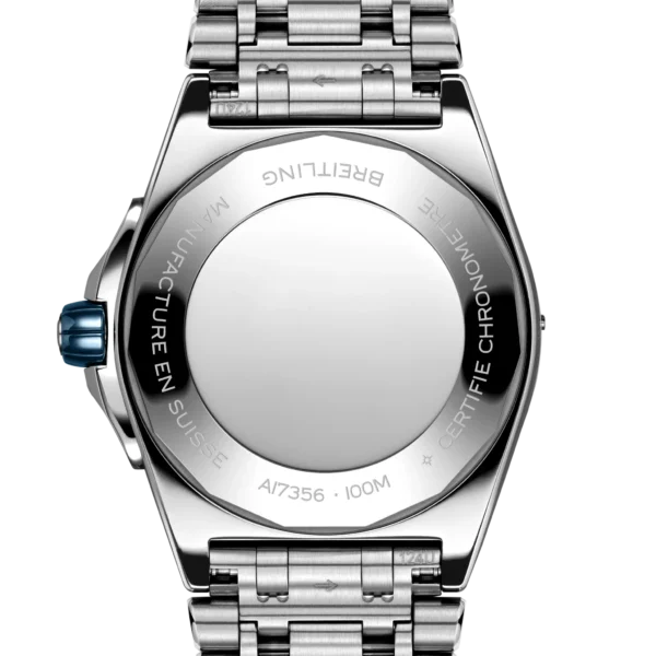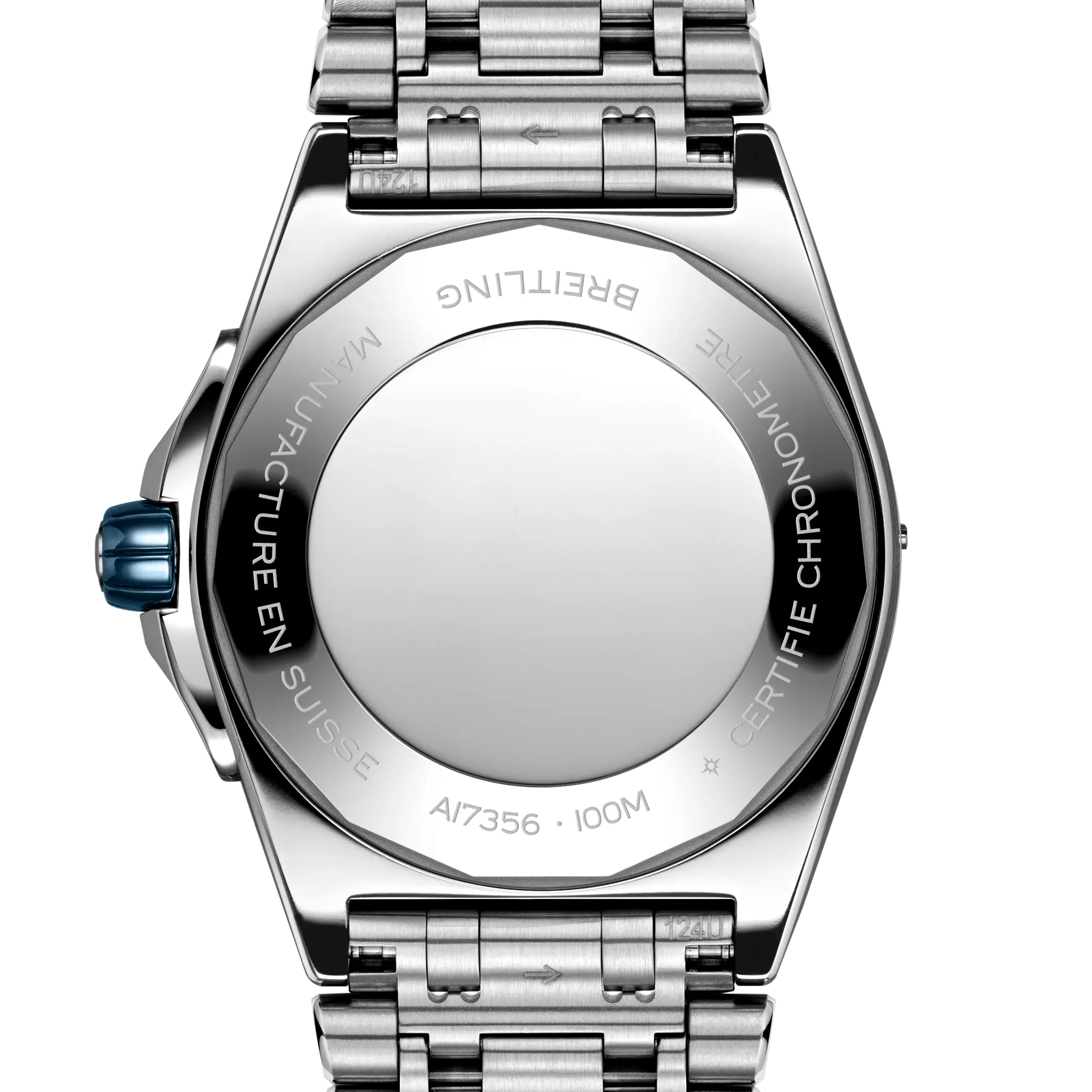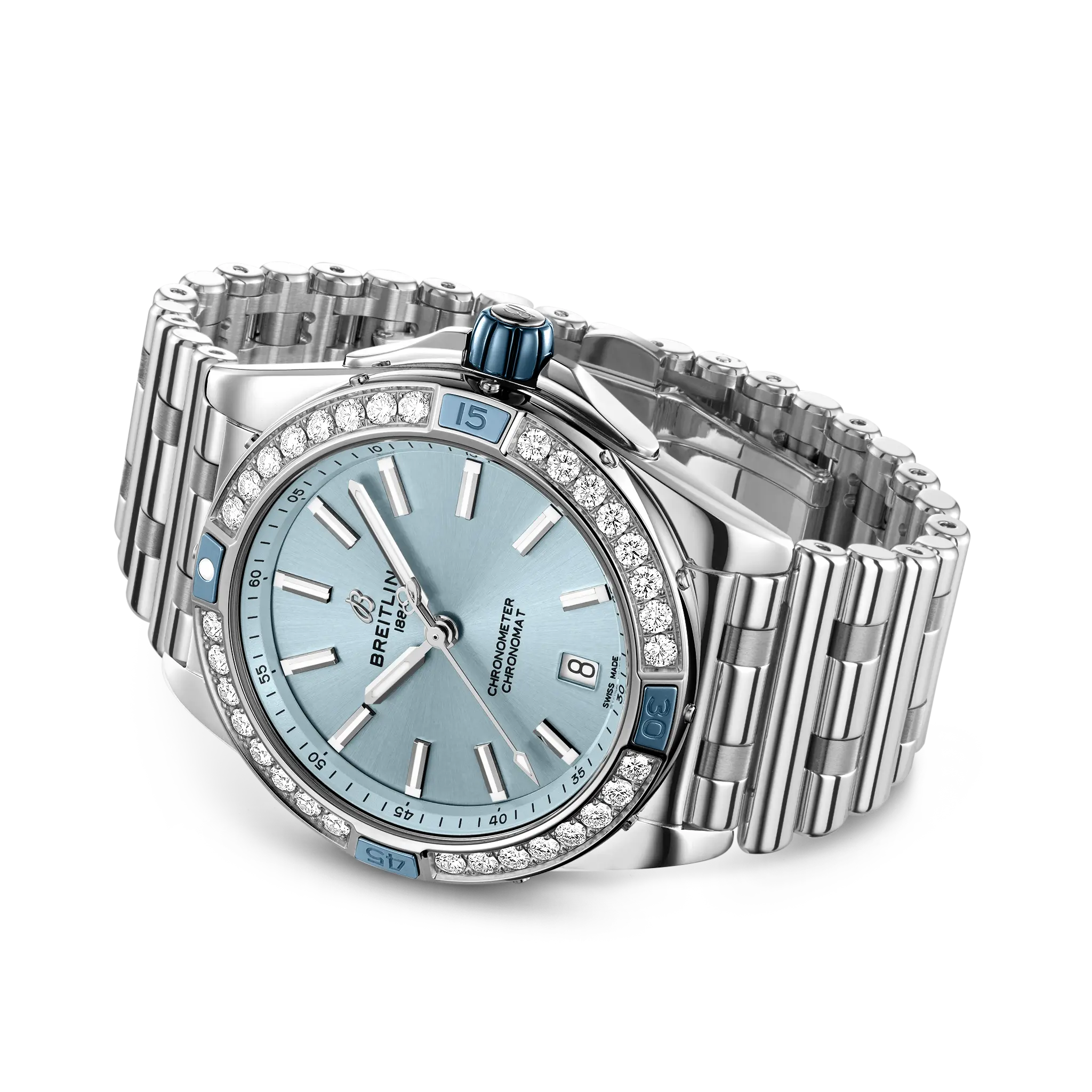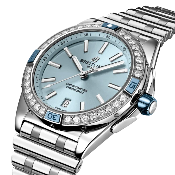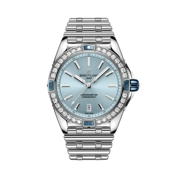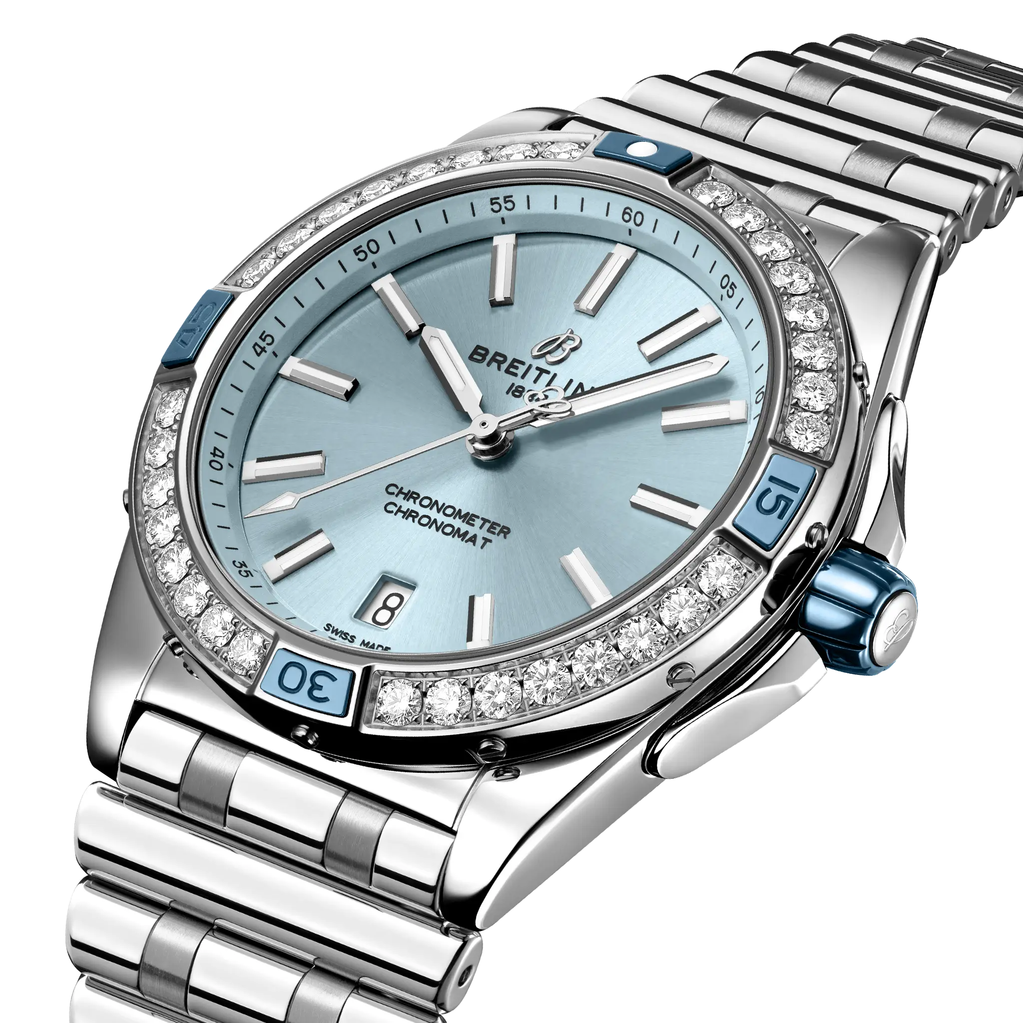 Breitling Super Chronomat Automatic 38 mm zaprojektowano tak, aby wyróżniał się zarówno w połączeniu z kombinezonem sportowym, jak i t-shirtem oraz dżinsami. Model Chronomat Automatic 38 mm można odróżnić od pozostałych modeli po ceramicznych wypustkach i koronce oraz gumowej bransoletce Rouleaux, dostępnej wyłącznie w tej linii. Kopertę zdobią diamenty wyhodowane w laboratorium osadzone na pierścieniu zegarka. Czasomierz prezentuje się fenomenalnie, diamenty dodają czasomierzowi szyku i elegancji. Całości dopełnia elegancka, stalowa bransoleta. Breitling Super Chronomat Automatic 38 mm objęty jest dwuletnią, międzynarodową gwarancją producenta.