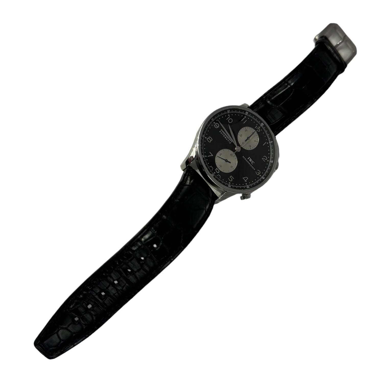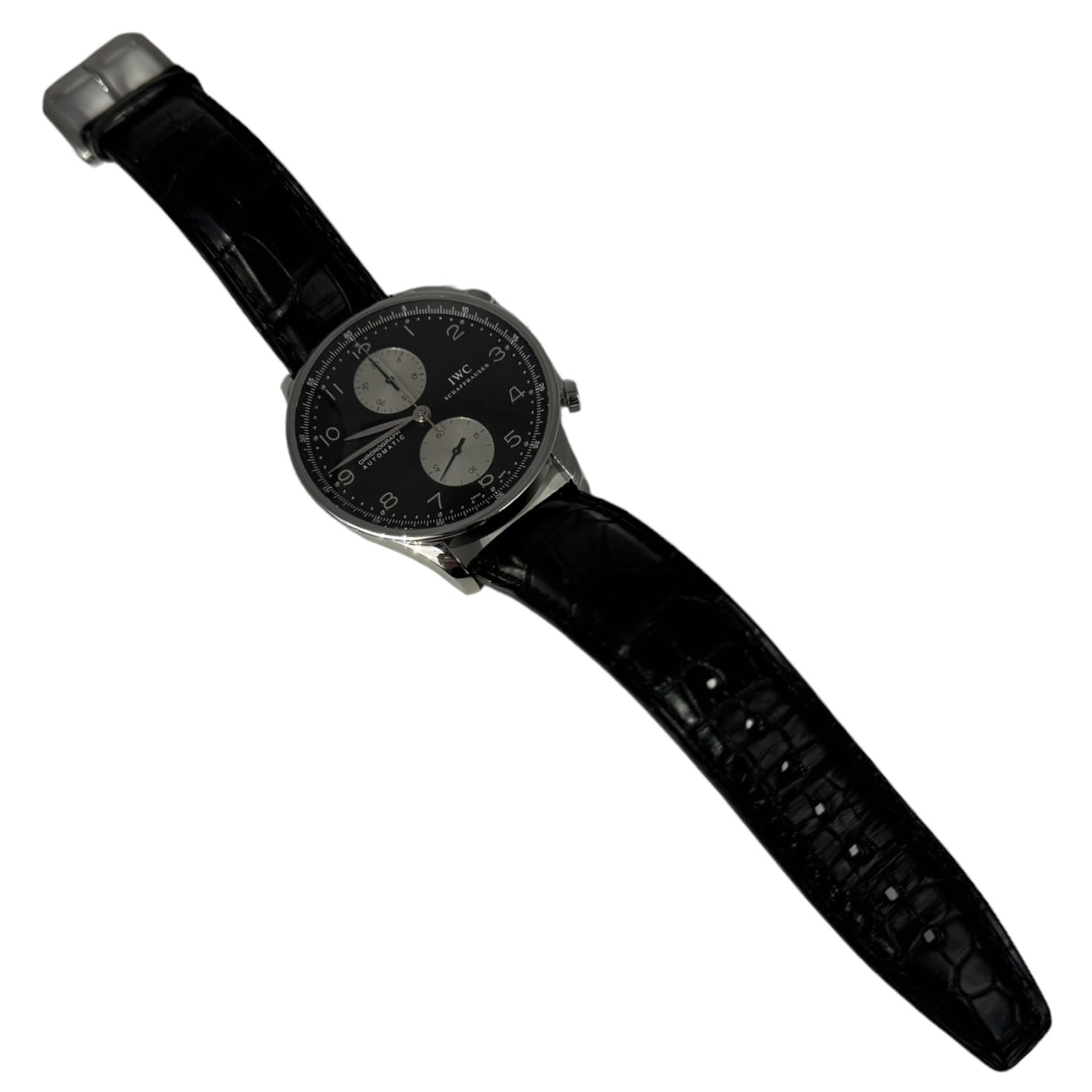 Zapraszamy do zakupu używanego czasomierza renomowanej manufaktury IWC, model Portugieser Automatic Chronograph 41 mm. Linia Portugieser to jedna z najbardziej kultowych linii IWC Schaffhausen. Dzięki kompaktowej średnicy 41 milimetrów pasuje niemalże na każdy nadgarstek. Na przejrzystej, funkcjonalnej tarczy znajdują się cyfry arabskie i smukłe wskazówki Feuille. Charakterystyczny réhaut, wydrukowany ze skalą ćwierćsekundową, nie tylko umożliwia precyzyjny odczyt czasu zatrzymania, ale także przypomina nam o początkach Portugiesera jako precyzyjnego instrumentu żeglarskiego na nadgarstku. Kopertę wykonano ze stali szlachetnej. Sercem zegarka jest mechanizm z naciągiem automatycznym, Cal. 79350, którego rezerwa chodu, przy maksymalnie nakręcanej sprężynie wynosi do 44 godzin. Całości dopełnia pasek ze skóry krokodyla sygnowany przez IWC Schaffhausen. Pasek jak i zegarek jest w stanie niemalże idealnym. Do zegarka dołączone są dokumenty zegarka. Zakupiono go w naszym Salonie. Oferujemy dwunastomiesięczną gwarancję za zegarek.