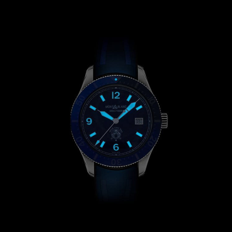 Montblanc 1858 Iced Sea Automatic Date, pierwszy w historii sportowy zegarek do nurkowania firmy Montblanc, ma tarczę ze wzorem lodowca, która sprawia wrażenie, jakby ktoś zaglądał w głąb lodowca. Ta niebieska tarcza ze wzorem lodowcowym inspirowana jest Mer de Glace – Morzem Lodu – głównym lodowcem masywu Mont-Blanc. Jego teksturę uzyskano za pomocą prawie zapomnianej techniki przodków zwanej gratté-boisé. Zegarek jest wyposażony w jednokierunkową dwukolorową ceramiczną ramkę, grawerowany dekiel i wymienny niebieski gumowy pasek z precyzyjnym systemem regulacji. Zegarek jest zgodny z normą ISO 6425 dotyczącą zegarków nurkowych i jest wodoodporny do 300 metrów. Niebieski kolor tarczy odnosi się do lodowców Mer de Glace To elegancki i luksusowy model, który jest połączeniem klasycznej estetyki z nowoczesnymi elementami. Jego koperta wykonana jest z wysokiej jakości stali nierdzewnej, co gwarantuje trwałość i odporność na uszkodzenia. Posiada klasyczny kształt okrągły, który nadaje zegarkowi uniwersalny wygląd, pasujący do różnych stylizacji. Na niebieskiej tarczy zegarka znajdują się indeksy godzinowe oraz wskazówki wykonane ze stali nierdzewnej, które doskonale kontrastują z niebieskim tłem. Całość jest chroniona przez szkiełko szafirowe, które jest wyjątkowo twarde i odporne na zarysowania. Funkcje zegarka obejmują datownik, który umieszczony jest na godzinie 3, oraz wskazanie sekundy, które znajduje się na godzinie 9. Zegarek jest napędzany precyzyjnym mechanizmem automatycznym, który zapewnia dokładność i niezawodność działania. Zegarek jest wygodny w noszeniu i trwały. to doskonały wybór dla osób ceniących luksusową estetykę, wysoką jakość wykonania oraz precyzyjne działanie. Jest to nie tylko praktyczny czasomierz, ale również stylowy dodatek, który podkreśla elegancję i prestiż noszącego.